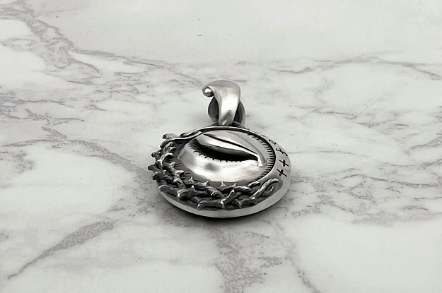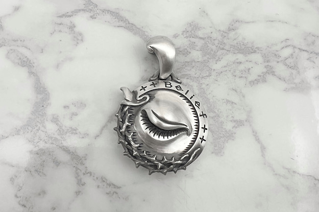 【盲信】をテーマに製作しました。 盲目に信仰する事の愚かさをメッセージとしてデザインしました。 閉じた目は肌の質感にまでこだわって造形し、美しさを感じさせながらもどこか物憂げな様子を表現しています。 アウトラインは【belief】(信仰)と刻まれたリボンと精巧に絡み合ったイバラを造形しました。 裏側に縫い目をデザインする事で「盲信」を表現しました。