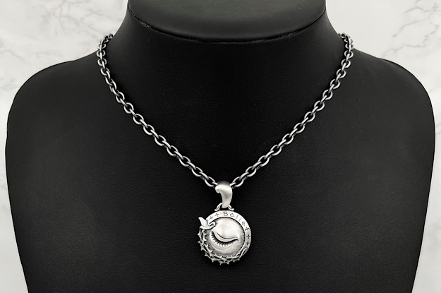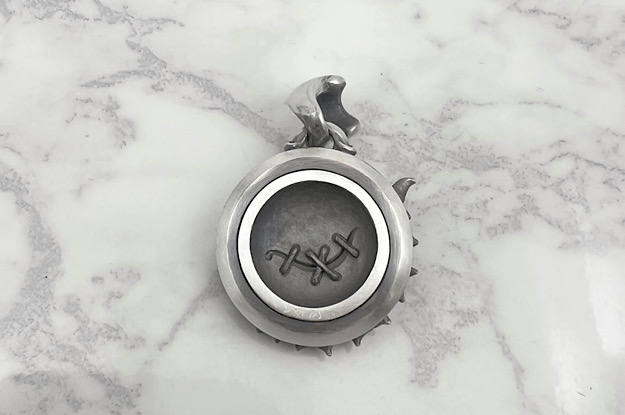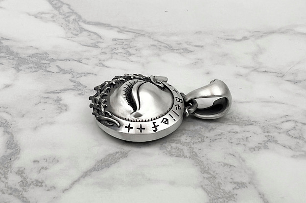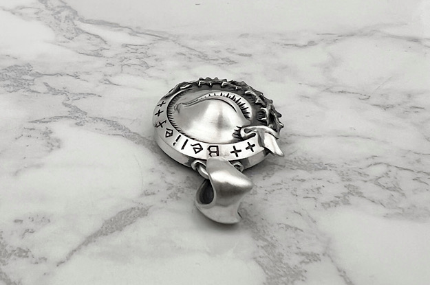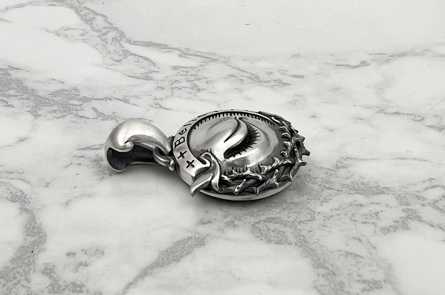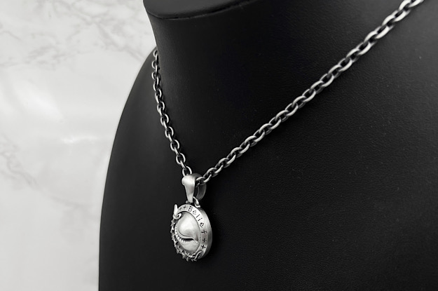 | ブラインドビリーフ "M" ペンダント ライト | Item No.MG-P-0067-R 総重量:約26g 正面縦寸法:40mm. 正面幅寸法:26mm. 燻し、艶消し仕上げ