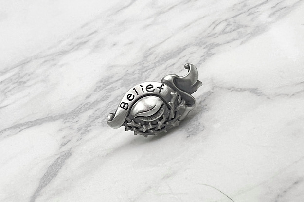 【盲信】をテーマに製作しました。 盲目に信仰する事の愚かさをメッセージとしてデザインしました。 閉じた目は肌の質感にまでこだわって造形し、美しさを感じさせながらもどこか物憂げな様子を表現しています。 アウトラインは【belief】(信仰)と刻まれたリボンと精巧に絡み合ったイバラを造形しました。 裏側に縫い目をデザインする事で「盲信」を表現しました。