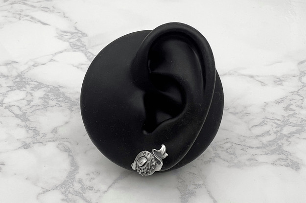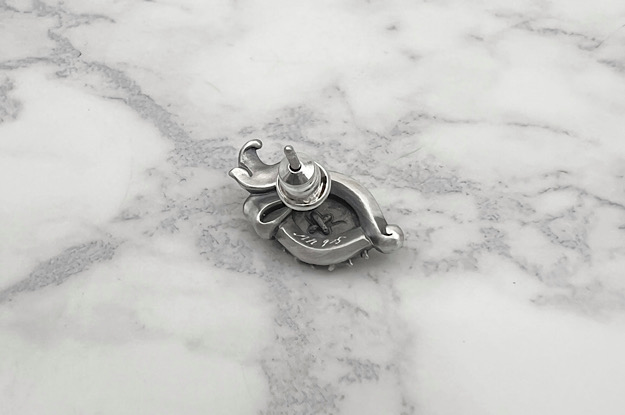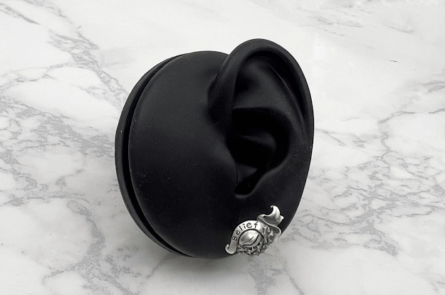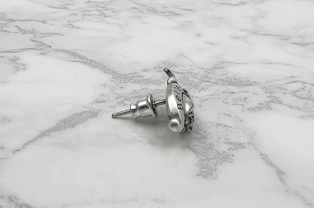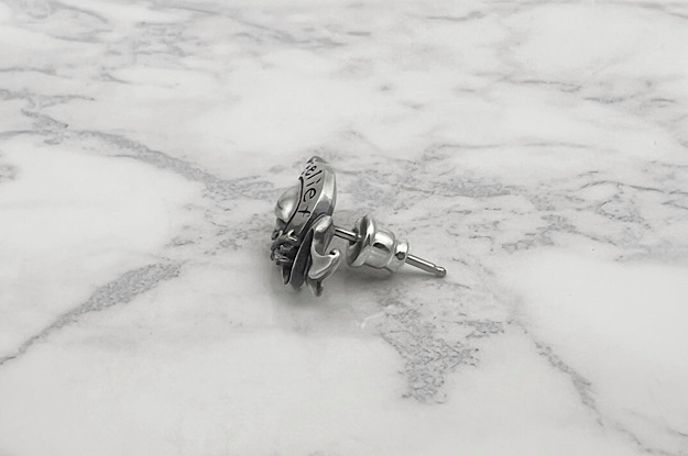 | ブラインドビリーフ "M" ピアス レフト | Item No.MG-PE-0038-L 総重量:約3g 正面縦寸法:10mm. 正面幅寸法:19mm. 燻し、艶消し仕上げ
