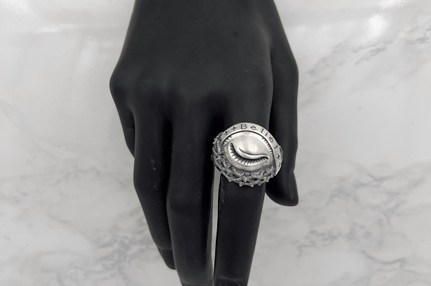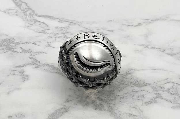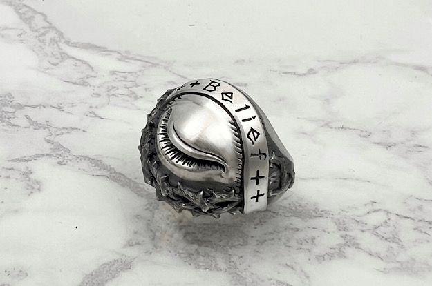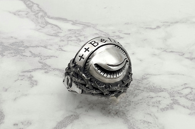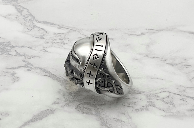 アウトラインは【belief】(信仰)と刻まれたリボンと精巧に絡み合ったイバラを造形しました。