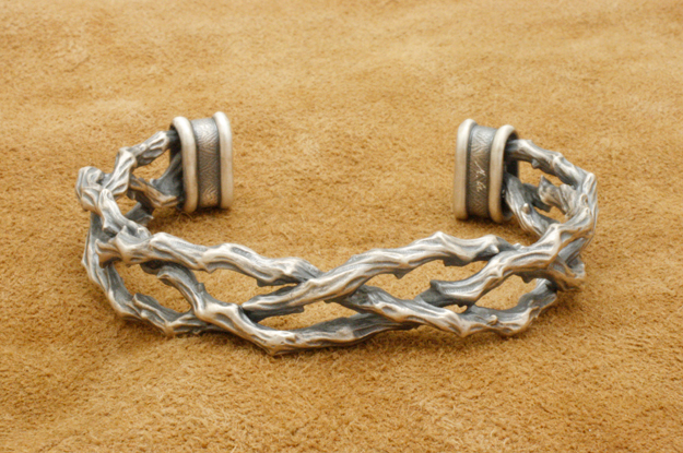 『受難』を主題として製作したバングル。「苦難にこそ生の実感を得る」をデザインテーマとし、生きる上では避けて通れない苦難の時、それを受け入れる覚悟を持ってほしいという想いで製作しています。イバラには立ち枯れしたような造形を施しました。また、手首内側の部分にはキリストが磔刑にされた際の罪状書きの頭文字『INRI』彫刻し、土台には磔刑をイメージした木目を彫り込みました。 |