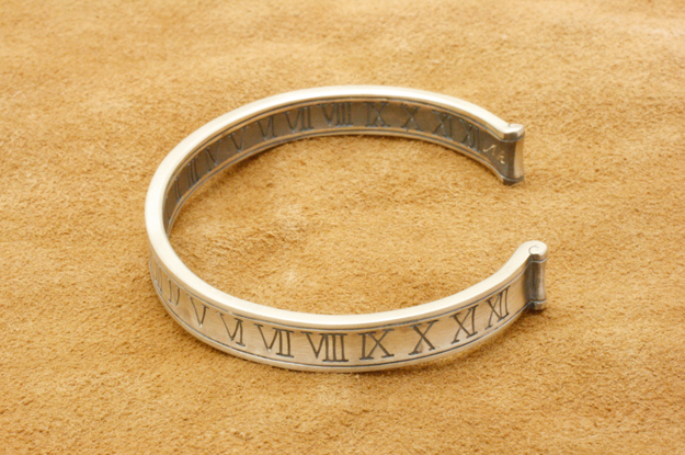 時間をテーマに【絶対】という題名で製作しました。 巡る時の流れをシンプルな円で表現しました。 表面は曲線的な逆甲丸の形状に直線的なローマ数字でコントラストをきかせました。 数字は1から12を2回繰り返して1周で1日を示しており、着用時には見えない内側にまで彫り込みました。 着用口はアンティーク家具やゴシック建築の装飾に見られる造形を施しました。 |