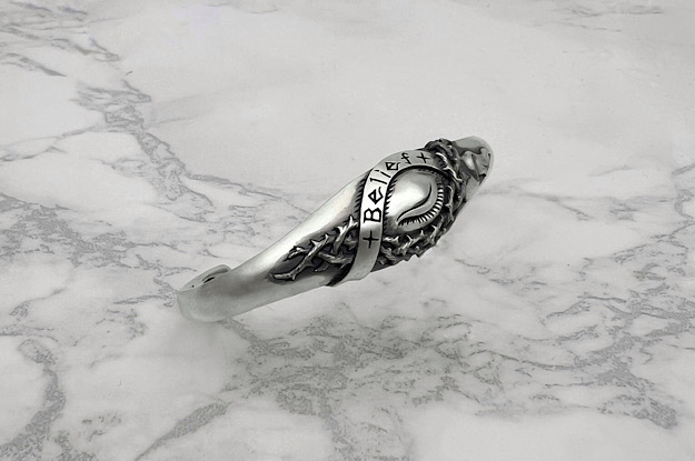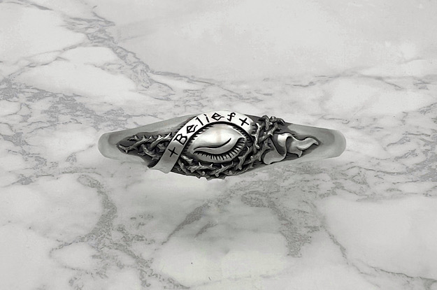 【盲信】をテーマに製作しました。 盲目に信仰する事の愚かさをメッセージとしてデザインしました。 閉じた目は肌の質感にまでこだわって造形し、美しさを感じさせながらもどこか物憂げな様子を表現しています。 アウトラインは【belief】(信仰)と刻まれたリボンと精巧に絡み合ったイバラを造形しました。 裏側に縫い目をデザインする事で「盲信」を表現しました。