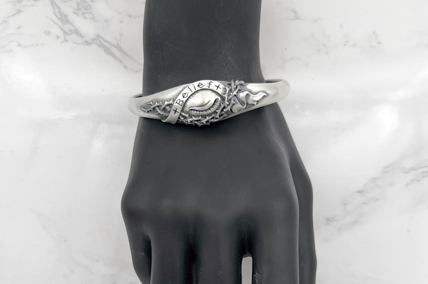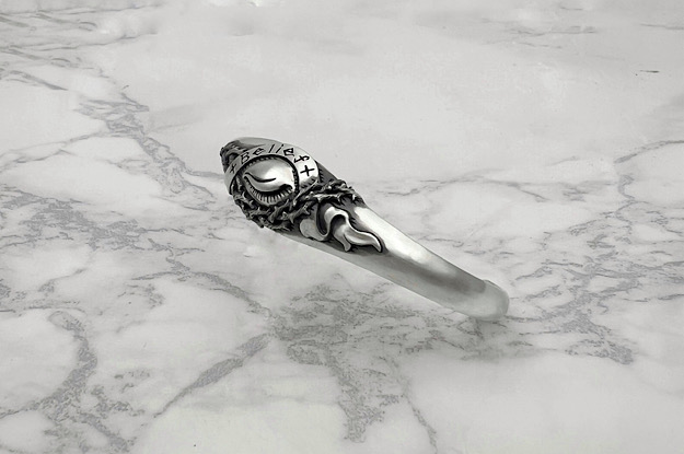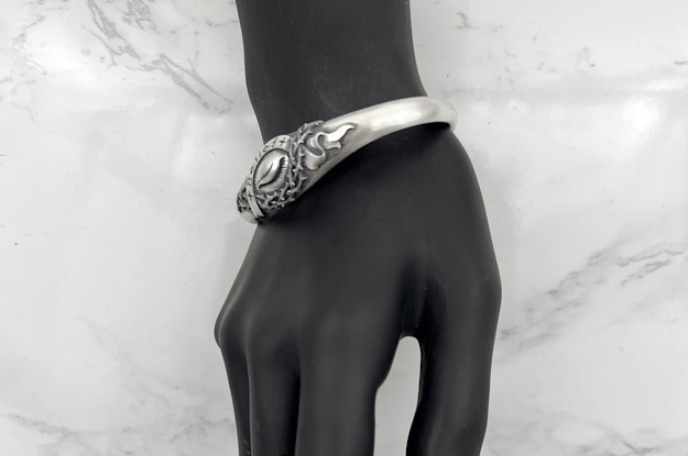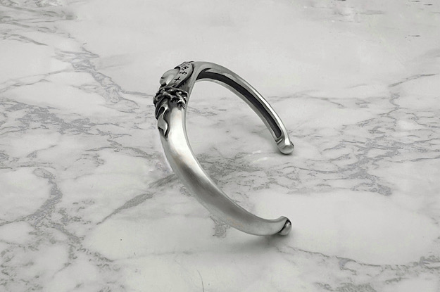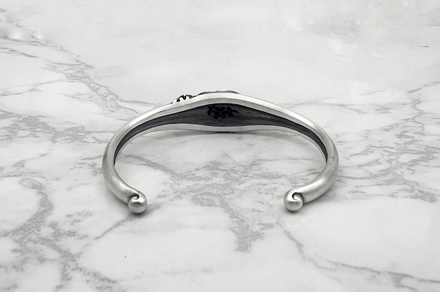 | ブラインドビリーフ "S" バングル レフト | Item No.MG-BG-0018-L 総重量:約36g 正面縦寸法:15mm. 内径円周:16.5cm. 内径横幅:60mm. 内径縦幅:40mm. 着用口寸法:32mm. 燻し、艶消し仕上げ