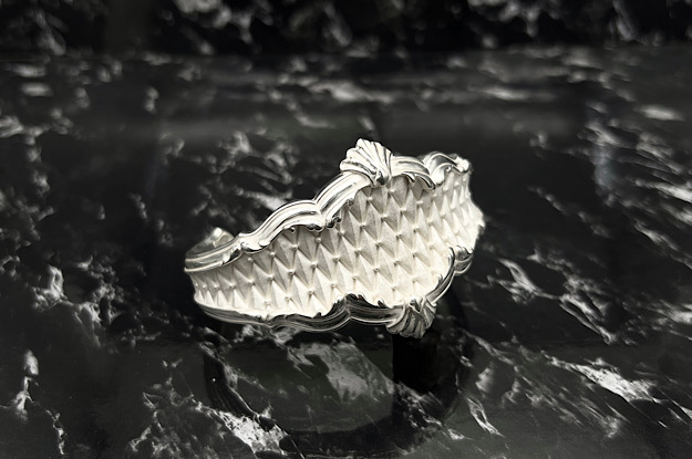 【玉座】をテーマに製作しました。 キルティングの椅子をロココ調で装飾したイメージで、 あえて中央に銀面を出さないことで新しいデザインを目指しました。 キルティング造形の部分は溝を深く掘ることで単色でも造形が わかりやすくなるようデザインしました。