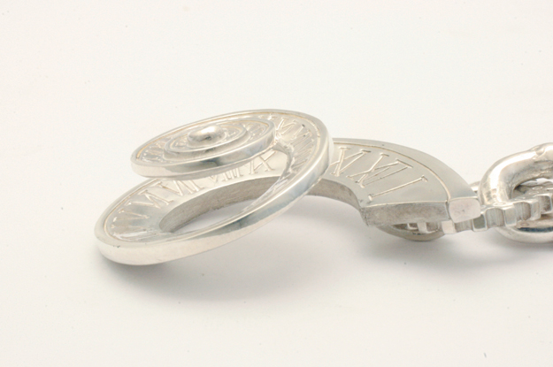時間をテーマに【絶対】という題名で製作しました。 誰もが逃れられない時の流れを渦で表現しました。 内側から外側に広がるラインは曲面で構成し、時計の文字盤をイメージした直線的なローマ数字とコントラストをきかせました。 正面から見て切れ目のない造形で作られたフックは、着用時に体側にフックの正面を向け表側にひっくり返すように着用します。 下部には機械的な歯車と鉄の鎖をイメージしたパーツを連結し、抗えない時の流れを表現しました。 |