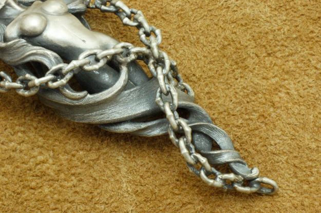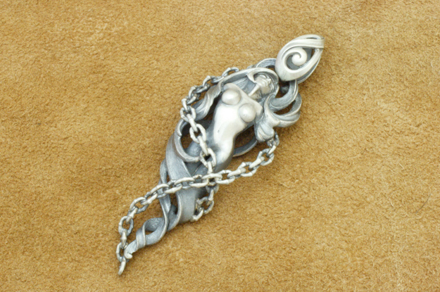 プリヴィリッジペンダントをベースにチェーンパーツでトッピングを施したワンメイクアイテム。チェーンパーツは一体的に見えるよう髪の流れに合わせて曲線を出しています。立体的に見えつつも出っ張りすぎないよう下部にあたる部分は一段彫り下げて交差させています。またレギュラーアイテムと印象を変えるため、髪全体にはテクスチャーを施して黒仕上げにしました。 |