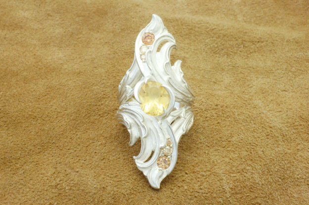 | OMC ツインソレンニティー"M"リング | Item No.MG-KC-180722WA リングサイズ:#21 サイズ直し不可 正面縦寸法:55mm リング腕部分最小縦寸法:6mm 総重量:33.4g 石の種類とサイズ CZシャンパン 2mm×2石 CZシャンパン 3mm×2石 CZシャンパン 4mm×2石 シトリン 12mm×10mm 1石