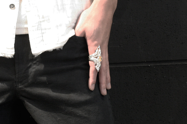 2つのソレンニティーMリングを重ね合わせて製作した正面縦寸法55mmの縦長シルエットで成形したワンメイクカスタムリング。センターには12×10ミリのシトリンをセッティングしています。留めている爪は曲線で構成する事で、ソレンニティーの曲線と一体感をだしています。 |