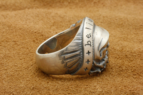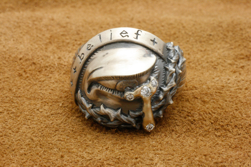 ブラインドビリーフリングをベースにストーン、K10、エングレーブで装飾を施したワンメイクカスタムリング。目は