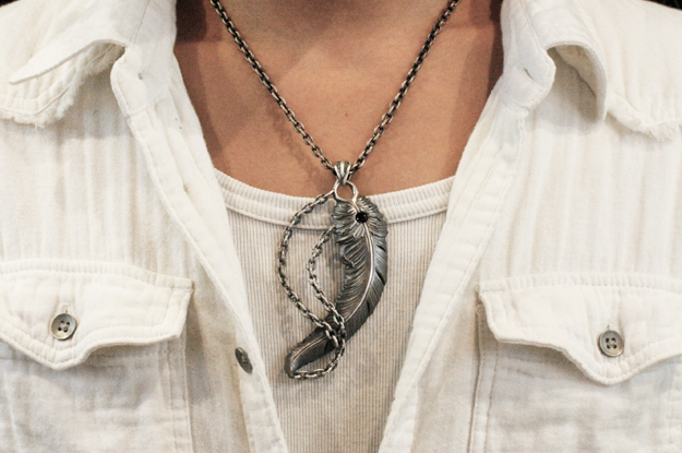 たワンメイクカスタムペンダント。レギュラーアイテムとの印象を真逆になるようフェザーにはラインに沿ったテク