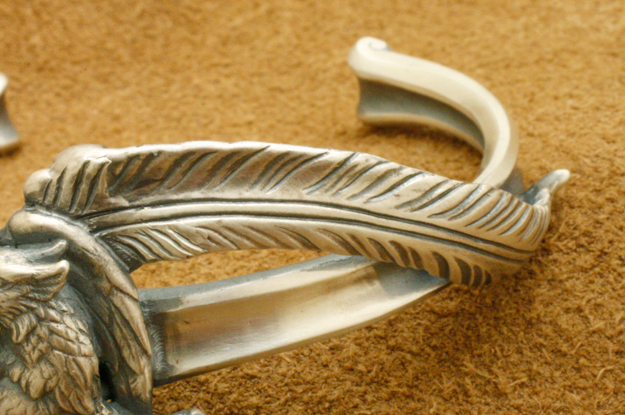 Guardiaのグリフィンペンダントをベースにブランドコラボレーションバングルを製作しました。降臨というテーマに合うよう左右非対称に舞い落ちるイメージでフェザーを造形し、上部は背後から光が差すようイメージで大粒のシトリンをセットしました。メインのグリフィン、立体的なフェザーと直線的なバングルベースを合わせて、異なる造形ながらも調和のとれたアイテムです。 |