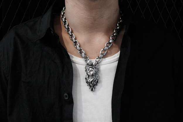 | OMC MG×GD メドゥーサネックレス | Item No.MG-OM-NL-0005 着用寸法:45cm 正面縦寸法:60mm 幅寸法:30mm 総重量:184.5g 石の種類 ガーネット
