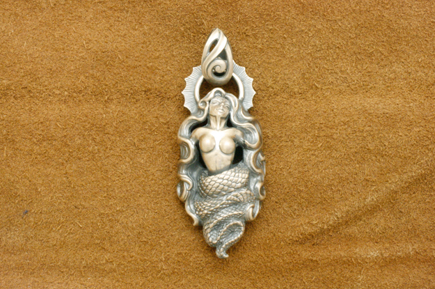 Guardiaのラミアリングをベースにブランドコラボレーションペンダントを製作しました。中央の女性像をMad Graffitiのプリヴィリッジに変更し、両脇を透かすことでより躍動感があり立体的に見えるよう切削しています。アウトラインはほとんど変更せずにMad Graffitiの特色を出したアイテムです。 |