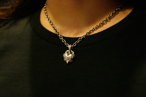 「独占」というテーマで作られたペンダント。柔らかな質感のハートに対照的な刺々しい茨を巻き付ける事で心の独占を表現。『これは自分の物だ。』と、どこか歪んだ愛の形をメッセージに逆十字として彫り込む。「愛の形は様々である。」 適度なボリューム感で着けていてズシッとくる重さが心地良い。男性にも女性にも着けられるデザイン。