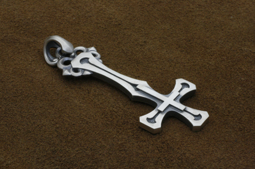 クロスを逆転させることで【反逆】を表現したクロスペンダント。 2重のクロスで思いの強さ、フラットな銀面でその思いの純粋さを表している。 ダークな一面を虚無なイメージで表現している部分がMad Graffitiの特徴でもあり、バチカン部分は3点の中心をチェーンが通る様な形状に製作するなど、細かなパーツの造形も特徴的。