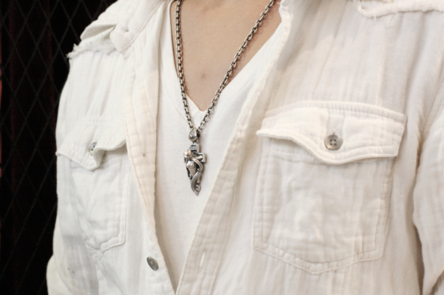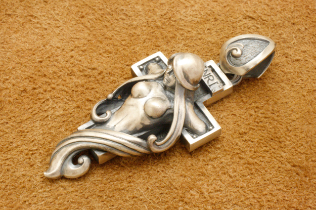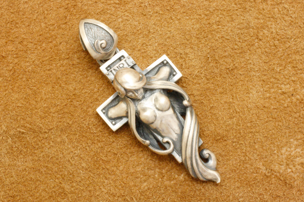 「存在自体が崇高とされるのは美しいものの特権である」という考えのもと、美しさにこだわって制作したペンダント。美しさが故に磔刑に処されたという魔女裁判のストーリーのもと、キリストの磔刑をイメージしてデザインしました。十字架の裏面とバチカンには木目の造形が施されています。
