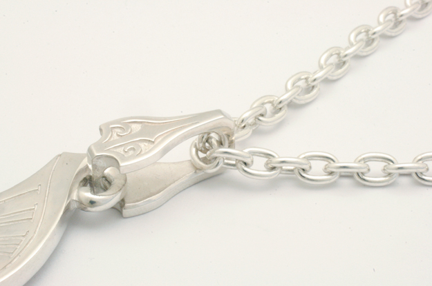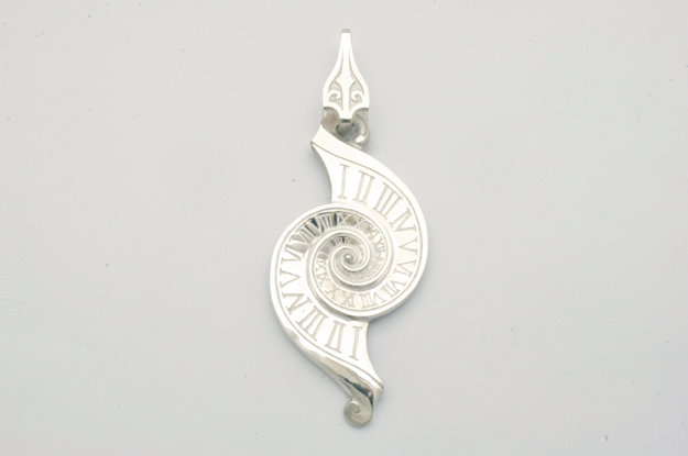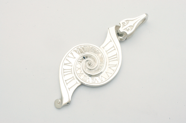 時間をテーマに【絶対】という題名で製作しました。 誰もが逃れられない時の流れを渦で表現しました。 内側から外側に広がるラインは曲面で構成し、時計の文字盤をイメージした直線的なローマ数字とコントラストをきかせました。 裏面も同様に渦状の造形を施してあります。 またチェーンを通すバチカンは時計の針をイメージしてデザインしました。 |