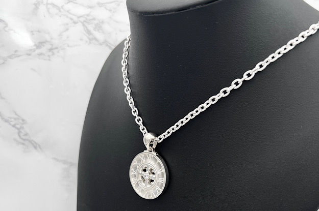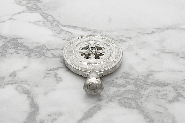 時間をテーマに【絶対】という題名で製作しました。 巡る時の流れをシンプルな円で表現しました。 表面は逆甲丸の形状に直線的なローマ数字でコントラストをきかせました。 また裏面にも文字を彫りとストーンをセットし、表裏ともに隙のないデザインになっています。