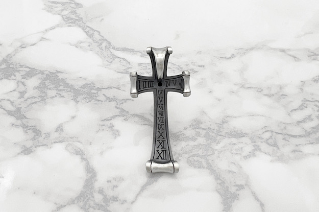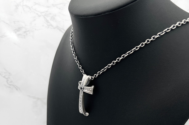 時間をテーマに【絶対】という題名で製作しました。 交差する時間の流れを十字で表現しました。 クロスは全体的に弧を描いており、見る角度により表情を変えます。 ローマ数字の彫り込みは裏面にまで施されており、自由に動くペンダントならではのデザインになっています。