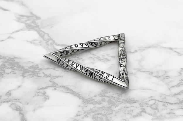 時間をテーマに【絶対】という題名で製作しました。 交わることのない時間の流れを捩じれた造形で表現しました。 様々な時間の流れを表現するため、ローマ数字は互い違いに行違うよう彫刻しました。 自然な捻じれた曲線を造形するため4面全てにローマ数字を彫刻した後で捩じる加工を施してあります。 着用時だけではなく、外した時にも隙の無いデザインに仕上げました。