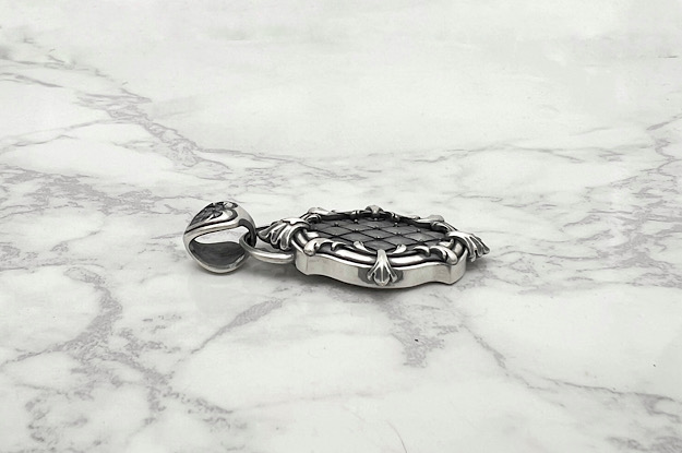 | スローン "M" ペンダント ブラック | Item No.MG-P-0064-BK 総重量:約29g 正面縦寸法:58mm. 正面幅寸法:28mm. 燻し、艶消し仕上げ