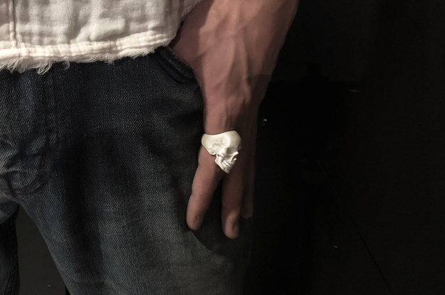 質な印象になる様に無表情なものにしました。またリング内側の脳に位置する裏抜きにはスカルの造形を施し、