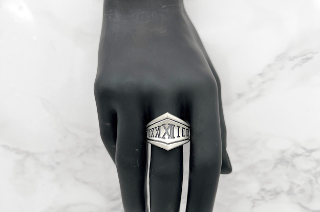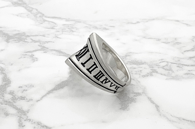 リングの造形、文字の彫り込みの両方でシンプルながらも立体的な造形を施しています。