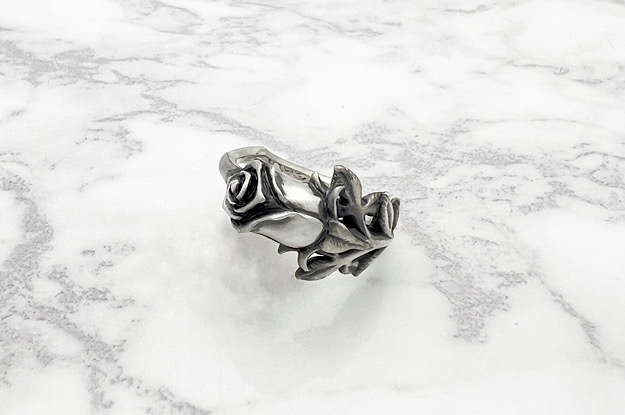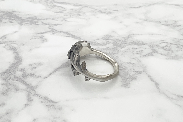 薔薇の花弁は蕾の状態に近くすることでインパクトを抑え、がく、茎、葉とバランスが取れるようデザインしまし